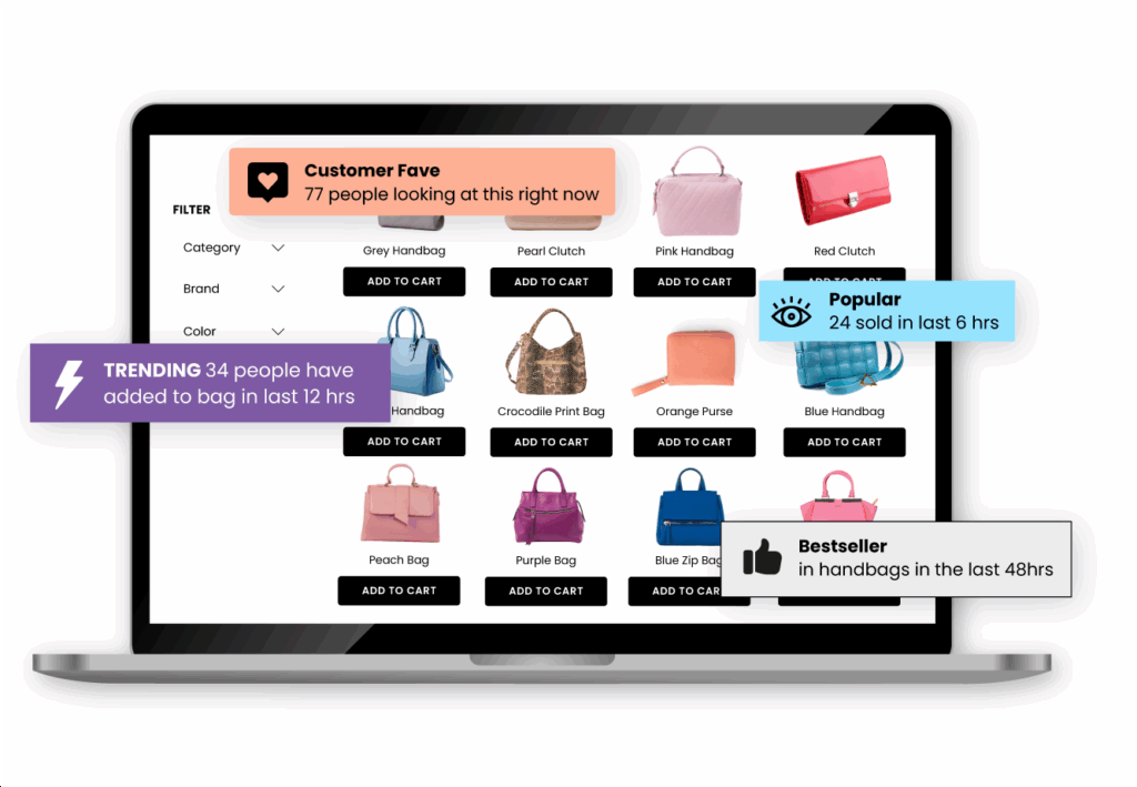 The powerful social proof combination is a clear way to tell shoppers that others are viewing that item, how quickly it’s selling and how many have sold. It’s another way to nudge shoppers towards the cart, and to increase online conversions and revenue.