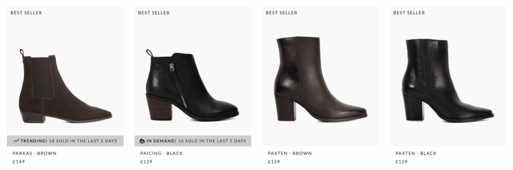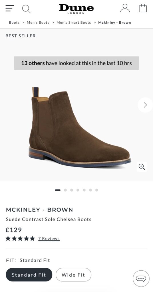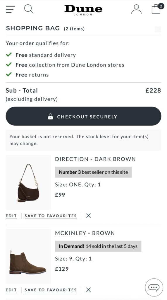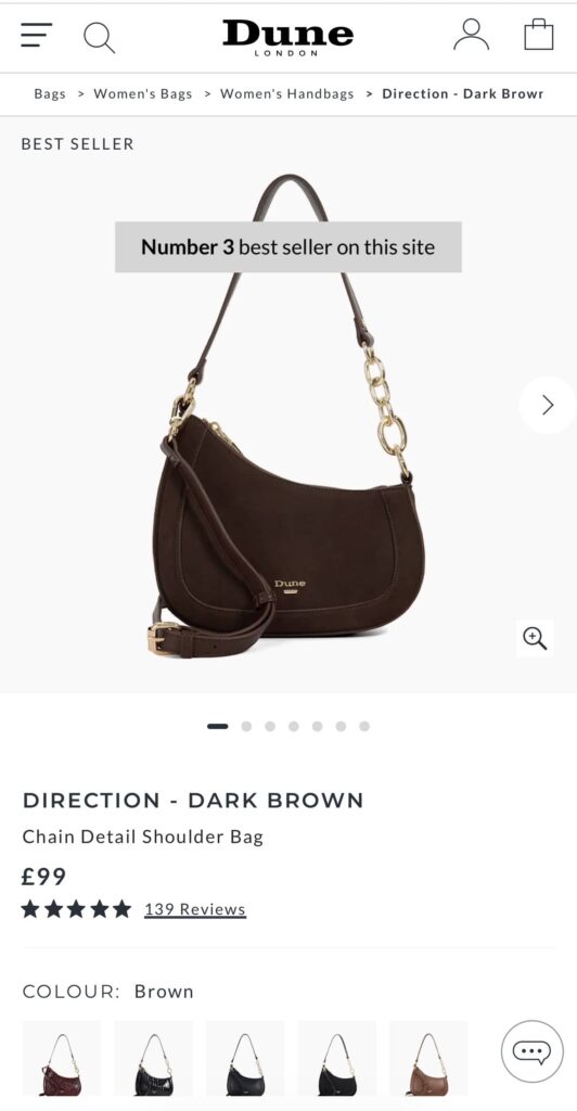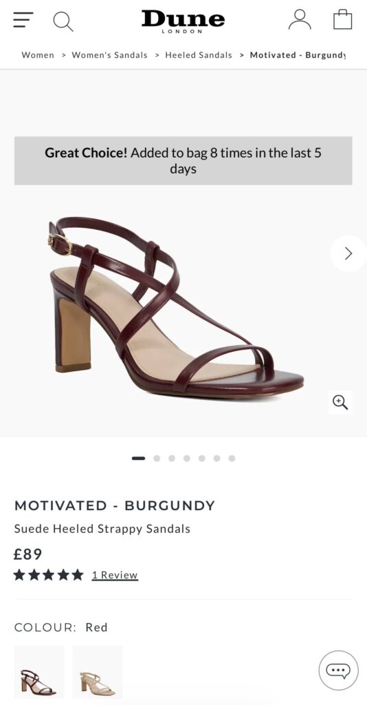 Having been introduced to Taggstar’s comprehensive social proof solution, Dune London ran a 23-day full-funnel test of its social proof messaging offering across its PDP, PLP and basket in July 2025. 13 core messages were used during the evaluation period. These included ‘X added to bag since your last visit X hrs ago’ and ‘Selling Fast! ‘Last sold 1 minute ago’.