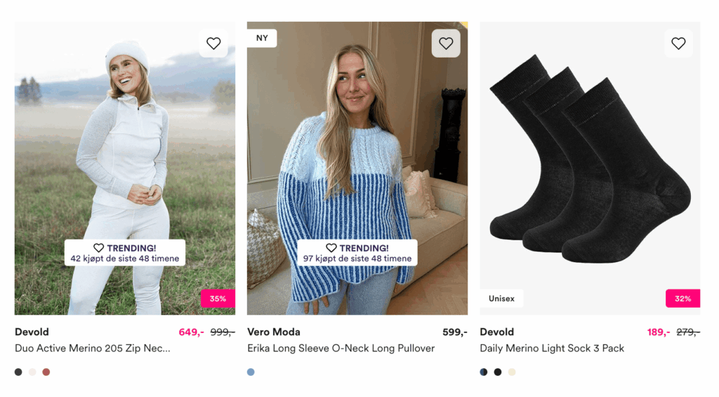 In its latest iteration, Getinspired.no tested social proof messaging on the PLP (Product Listing Page) across desktop and mobile for 29 days from 16 July to 13 August 2025. Three message types were used, including messaging such as ‘Purchased X times since last visit’, ‘Trending X purchased in the last 48 hours’ and ‘Selling Fast! X bought in the last X hours’.